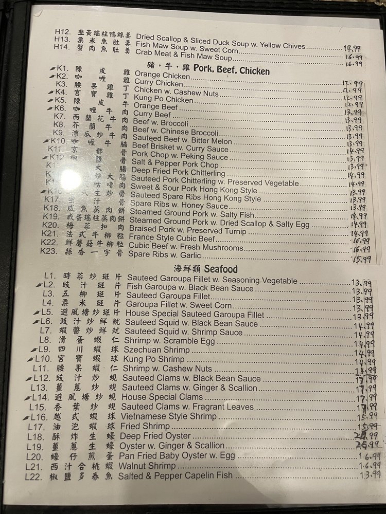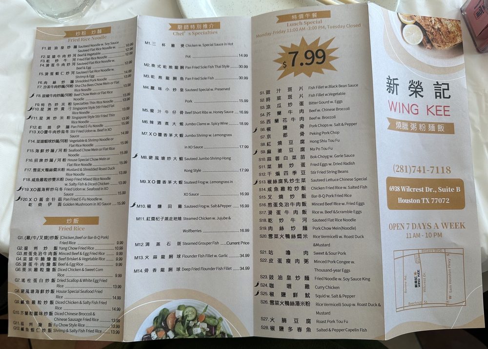 Wing Kee, located in Houston, TX, is a casual dining spot offering a wide range of Chinese dishes with many vegetarian options. The menu includes delectable soups like Seafood Supreme and Mixed Beef & Egg White, as well as flavorful vegetable dishes such as Sauteed Yu Choy and Baby Bok Choi. Seafood lovers can indulge in Spicy Salt Toasted Capelin and Prawn with Cashew Nut. With excellent customer reviews praising the authentic Cantonese flavors, Wing Kee is a must-visit for those craving traditional Chinese BBQ. The restaurant's clean ambiance, attentive service, and mouth-watering dishes like Roast Pork and house special chicken have won over the hearts of locals and visitors alike. Don't miss out on the experience of savoring the delicious offerings at Wing Kee.